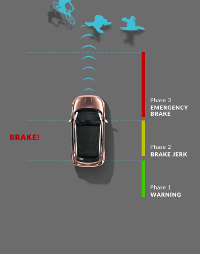 El nuevo sistema 500e funciona con tres niveles de intervención: aviso acústico, visual y sacudida de frenado. Si se detecta algún peligro, el sistema frena automáticamente el vehículo para evitar o mitigar una colisión con el vehículo de delante, un peatón o un ciclista. Además, el sistema también te avisará si el vehículo no está calibrado y si la cámara está cegada o falla.